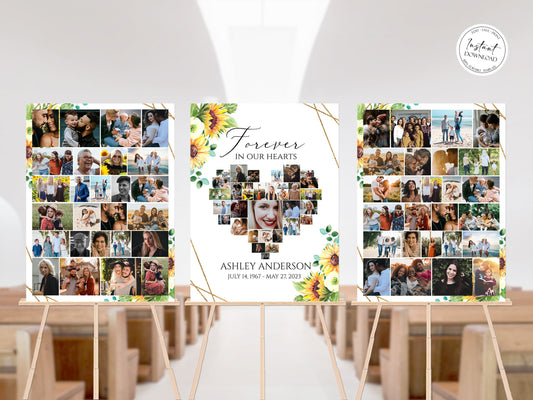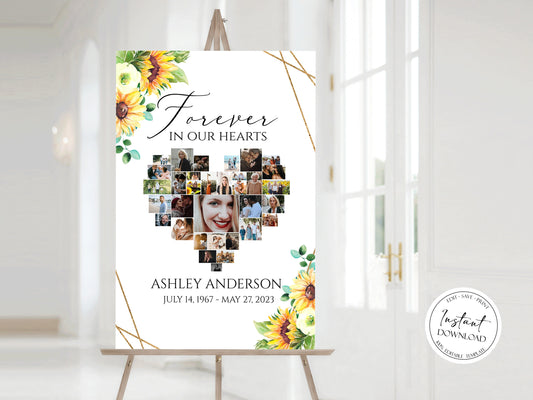 Forever in our Hearts Sunflower Heart Photo Collage Funeral Welcome Sign Template Y1