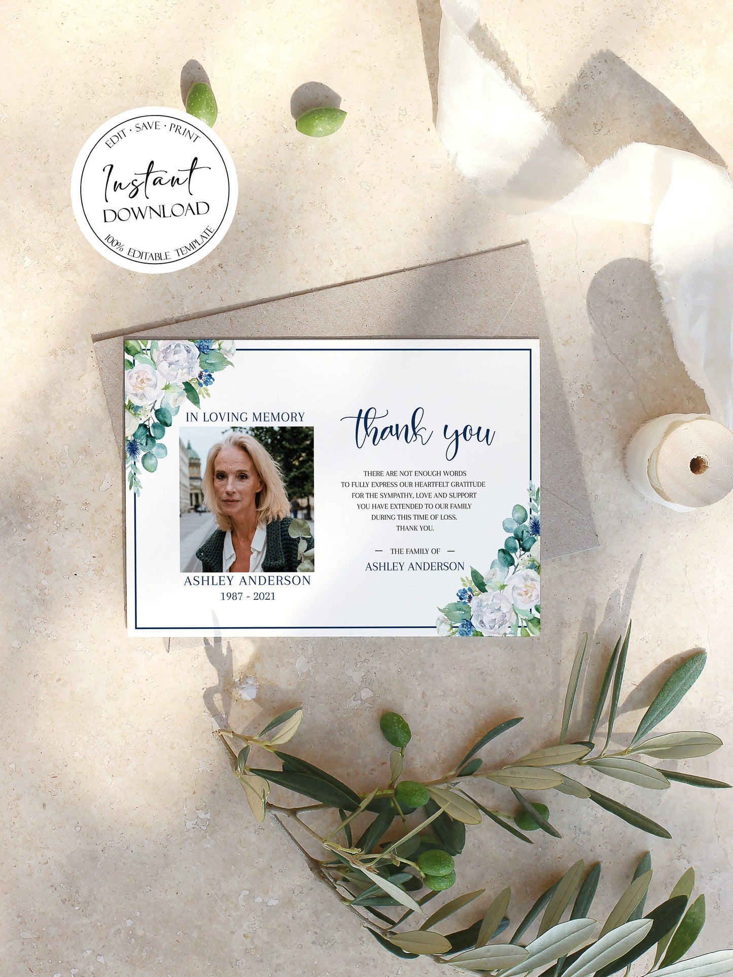 Celebration of life Blue White Floral Funeral Photo Thank You Card Template B1