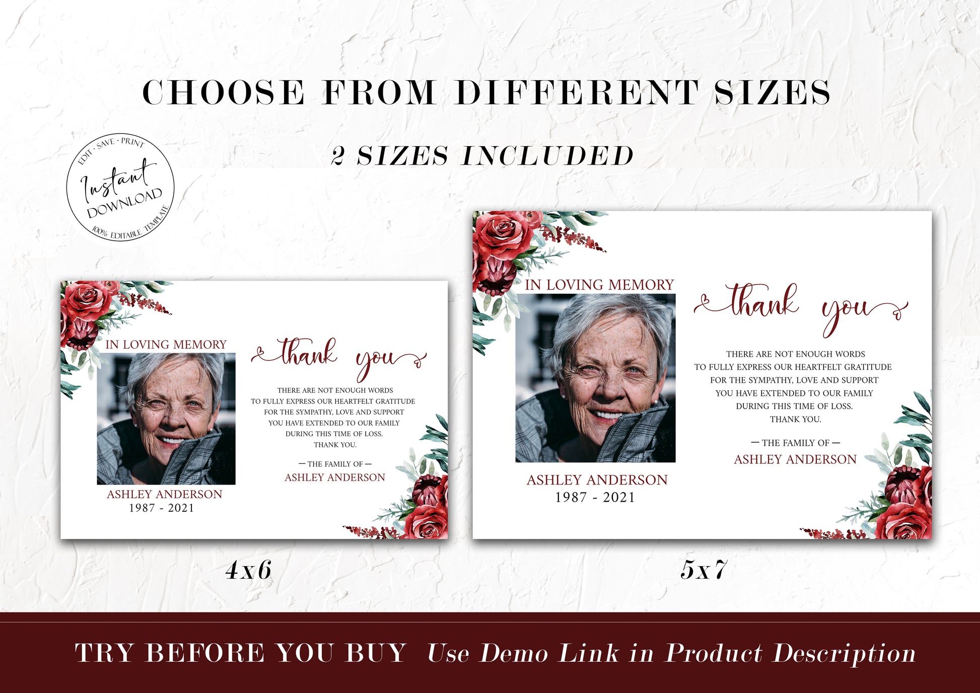 Celebration of life Burgundy Red Roses Funeral Photo Thank You Card Template R2