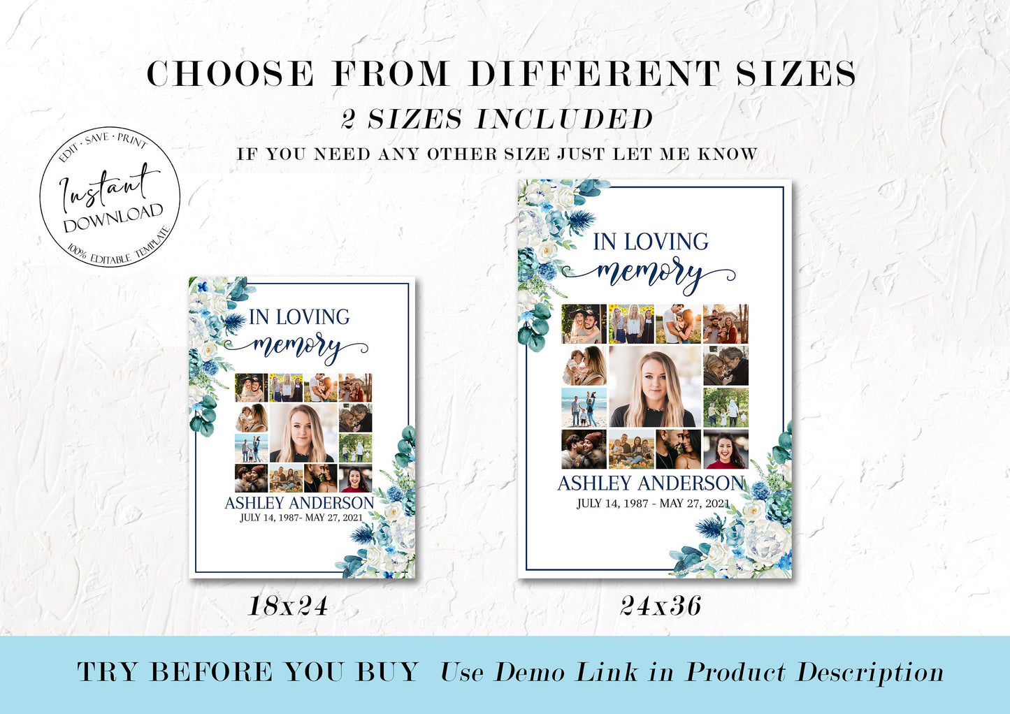 This is a Funeral Welcome Sign template of 65 photos that you can instantly edit, download and print yourself. This does not require a program/fonts to download.