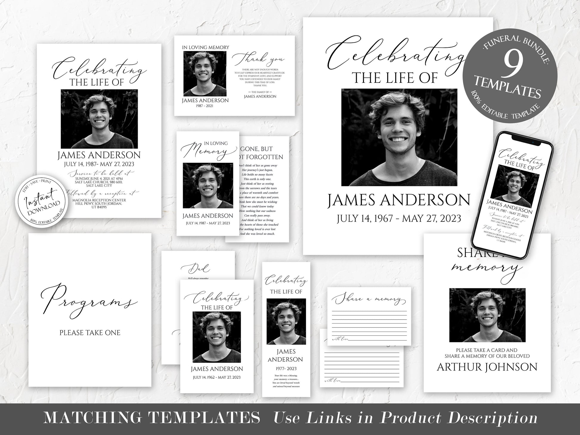 This is a Funeral Welcome Sign template of 13 photos that you can instantly edit, download and print yourself. This does not require a program/font to download.