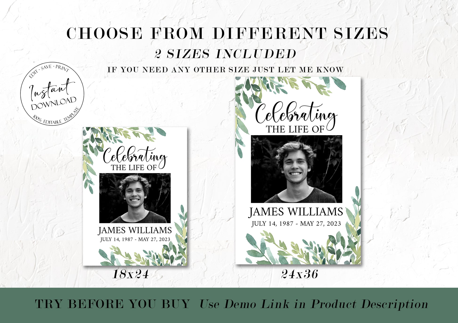 This is a Funeral Welcome Sign template of 105 photos that you can instantly edit, download and print yourself. This does not require a program/fonts to download.