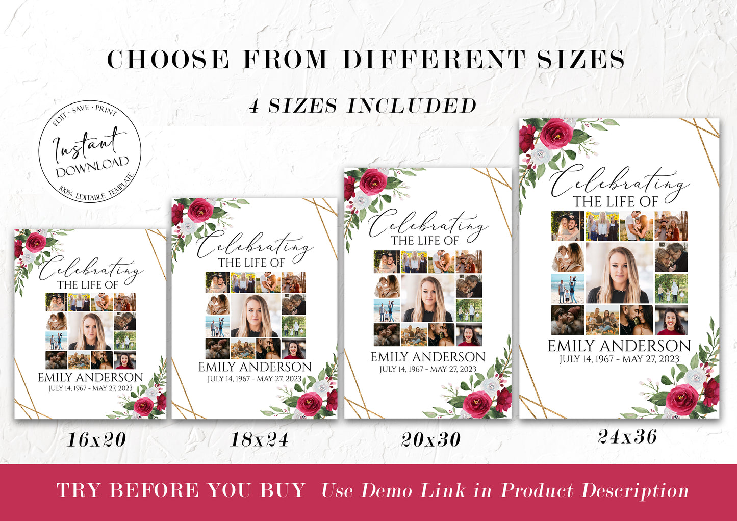 This is a Funeral Welcome Sign template of 13 photos that you can instantly edit, download and print yourself. This does not require a program/fonts to download.