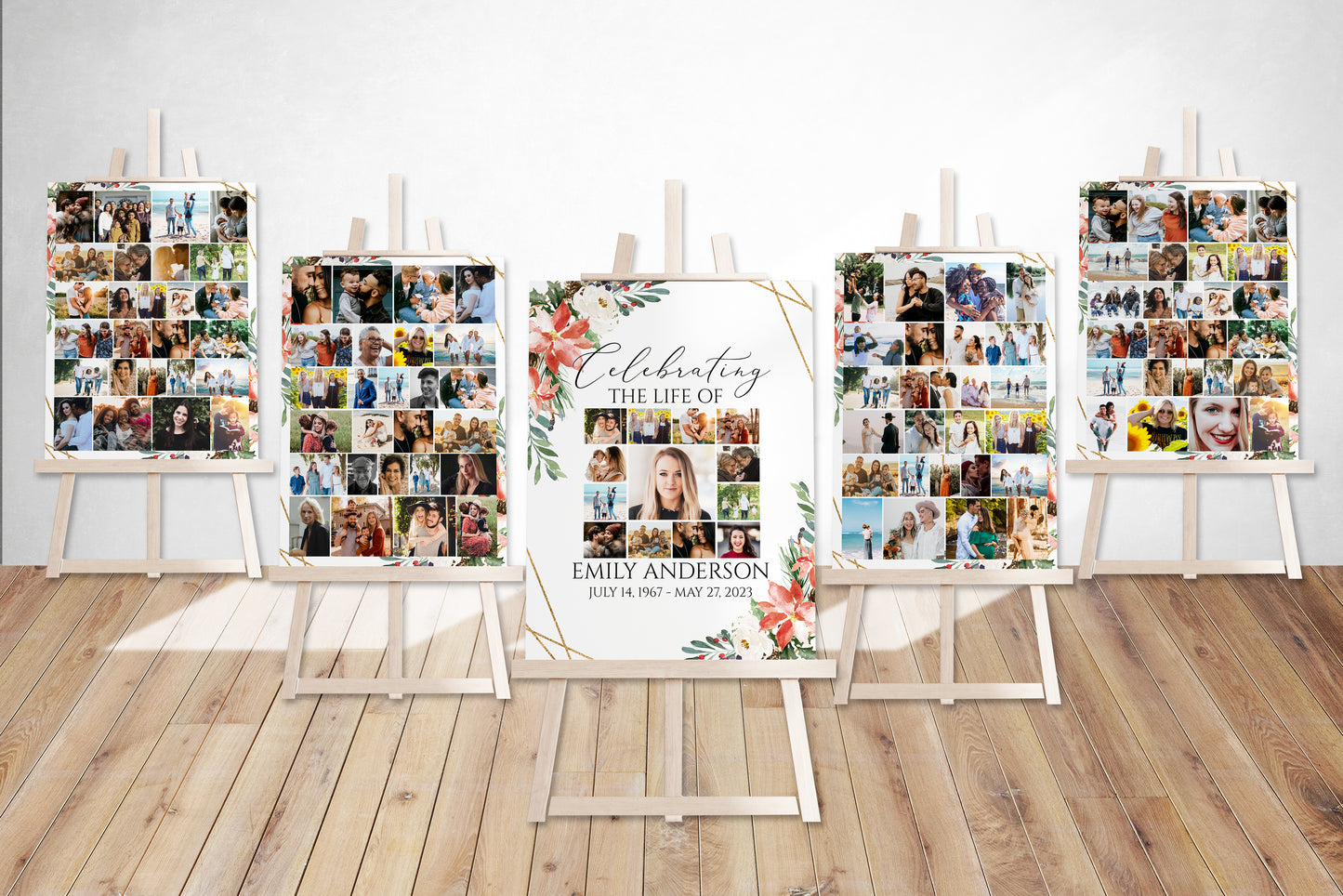 This is a Funeral Welcome Sign template of 117 photos that you can instantly edit, download and print yourself. This does not require a program/fonts to download.