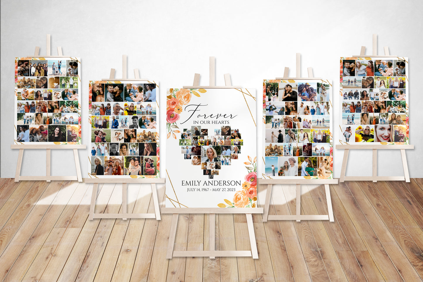 Forever in our Hearts Fall Orange Floral Gold Autumn Heart Photo Collage Funeral Welcome Sign Templates, Fall Heart Collage Funeral Sign, Memorial Photo Display Set